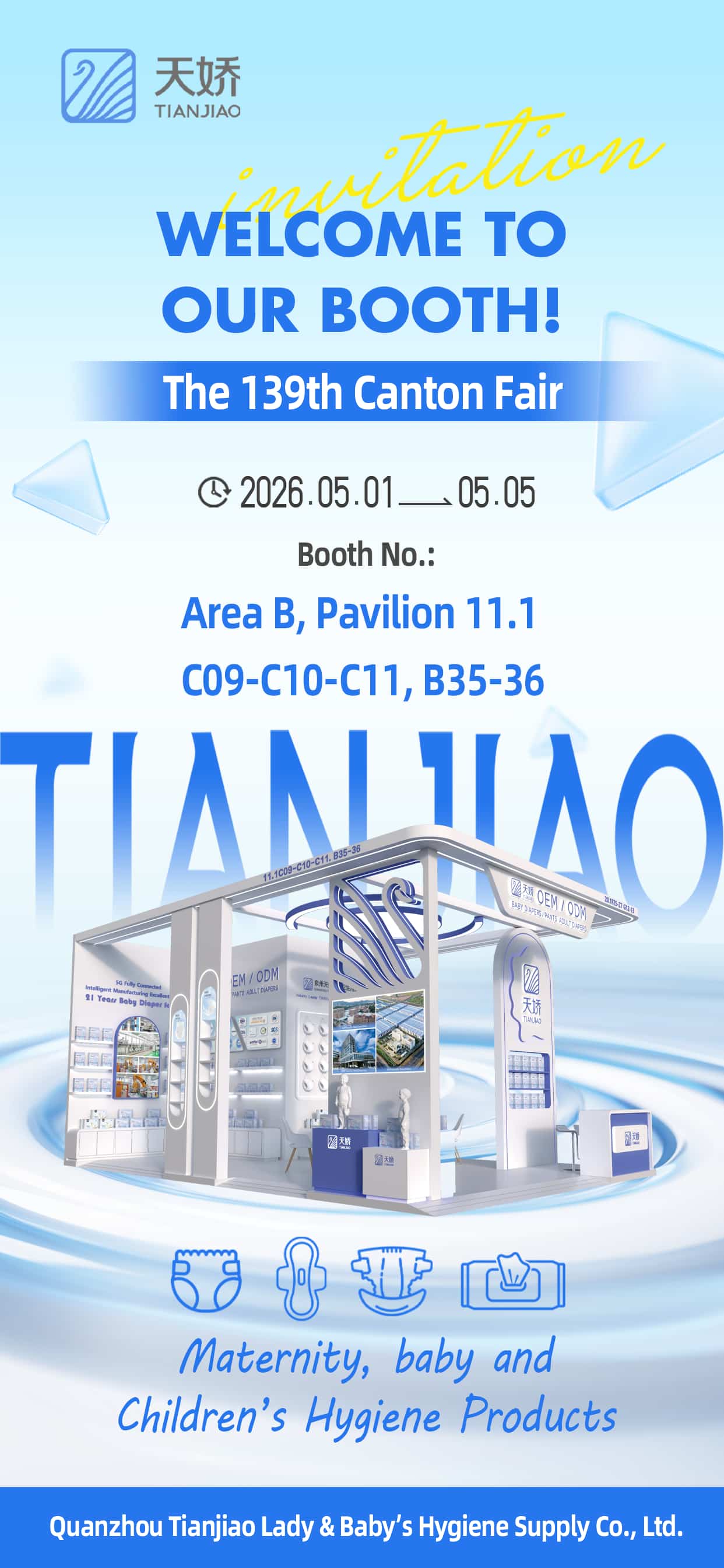 Products on display: baby diapers, adult diapers, sanitary napkins, wet wipes. Come to check product samples, enjoy on-site discounts, and discuss OEM opportunities. To schedule a meeting, please contact us via email. We look forward to seeing you!